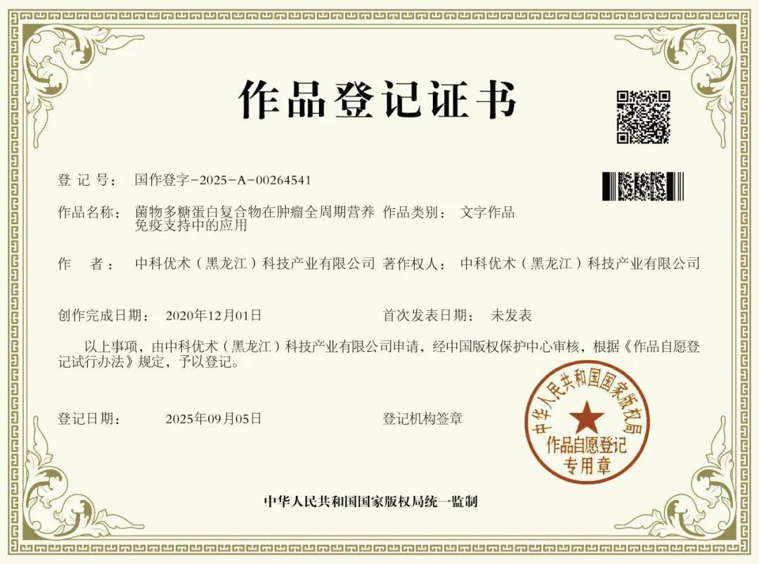 值得关注的是,菌物药研究中心已成功申请《菌物多糖蛋白复合物在肿瘤全周期营养免疫支持中的应用》著作权,相关成果已应用于肿瘤全周期管理重点科研项目。在肿瘤全周期管理中,菌物多糖蛋白复合物展现出精准适配价值:术前阶段,可有效改善特殊人群的营养储备,增强基础免疫功能;院内期间,能帮助特殊人群减轻放化疗导致的骨髓抑制和消化道不良反应等,提高治疗耐受性;康复阶段,通过精准免疫调节,帮助特殊人群维持机体稳态,降低复发风险。